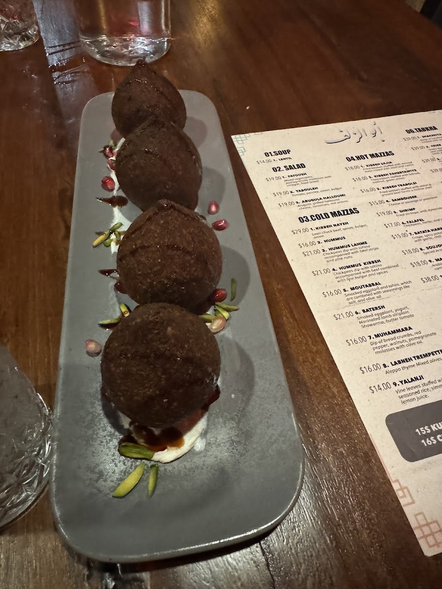 Kebbeh frit, farci de viande hachée mélangée à de la menthe et du cumin. / Fried kibbeh stuffed with minced meat mixed with mint and cumin.